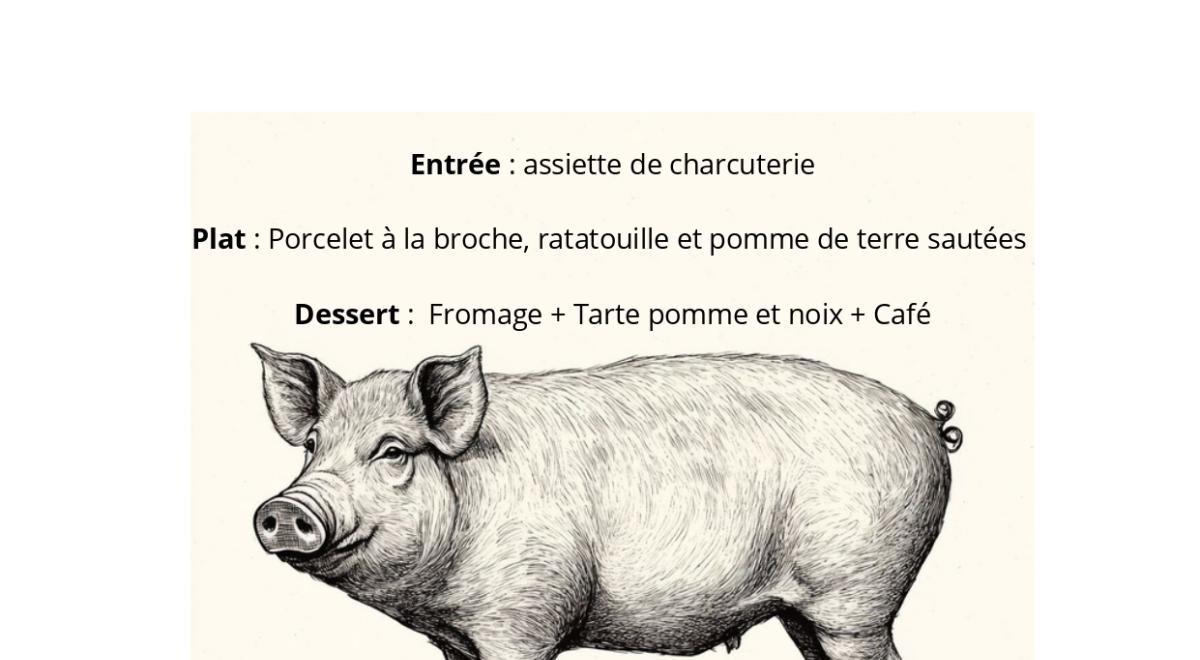 Le Séréna café vous propose un menu complet avec cochon à la broche, assiette de charcuterie, ratatouille, pommes de terre sautées, fromage, tarte pomme et noix, et café.