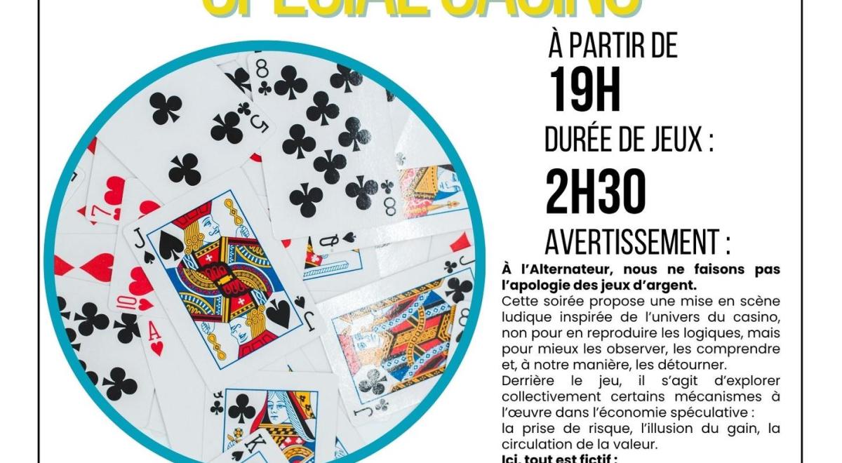 L'Alternateur organise une soirée jeux spéciale casino, une mise en scène ludique inspirée de l'univers du casino pour observer et comprendre ses mécanismes. Tout est fictif, sans gain ni perte, juste pour le plaisir et le divertissement.